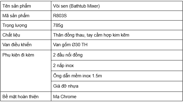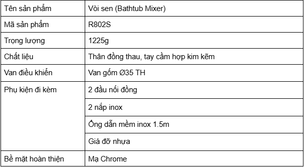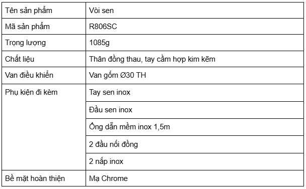 Thông số kỹ thuật bộ sen tắm Rossi R806SC