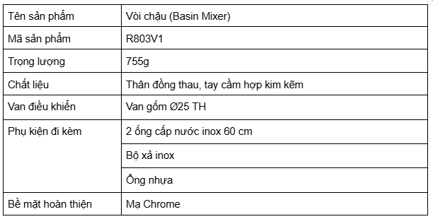 Với việc được chế tạo từ chất liệu đồng cao cấp, sản phẩm vòi chậu rửa R803V1 sẽ có đầy đủ các đặc tính gồm chống ăn mòn, chống oxy hóa, chống gỉ sét, độ bền cao, an toàn với nước sinh hoạt.